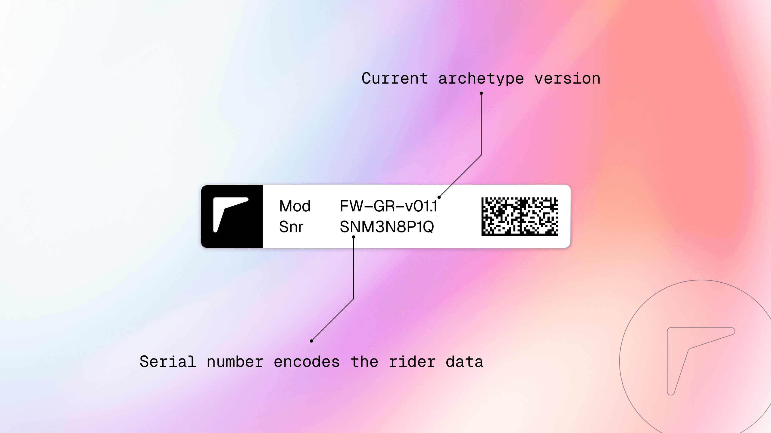 The serial badge references the current archetype and design algorithm. The rider data is encoded in the serial number. Visual labels allow tracing back the exact manufacturing data.