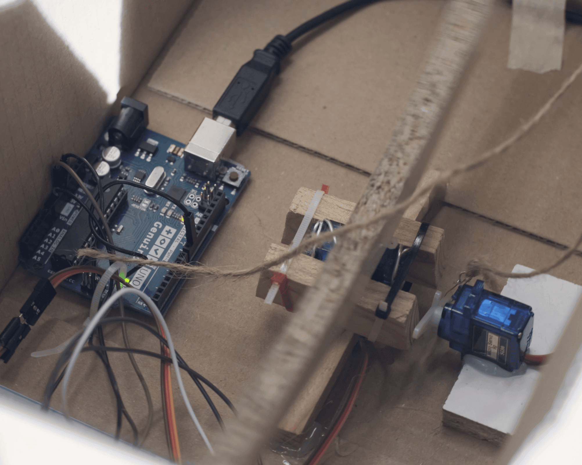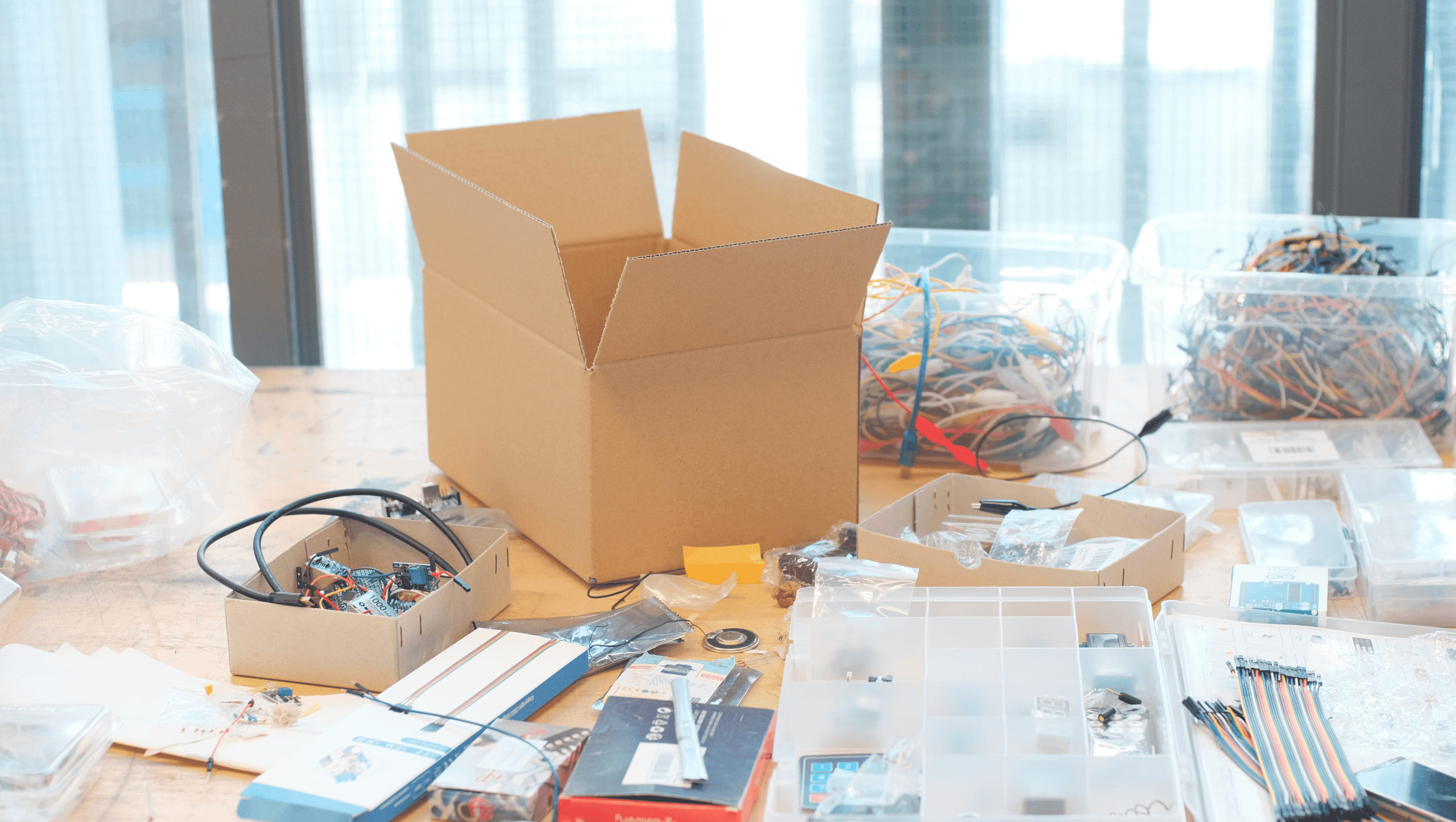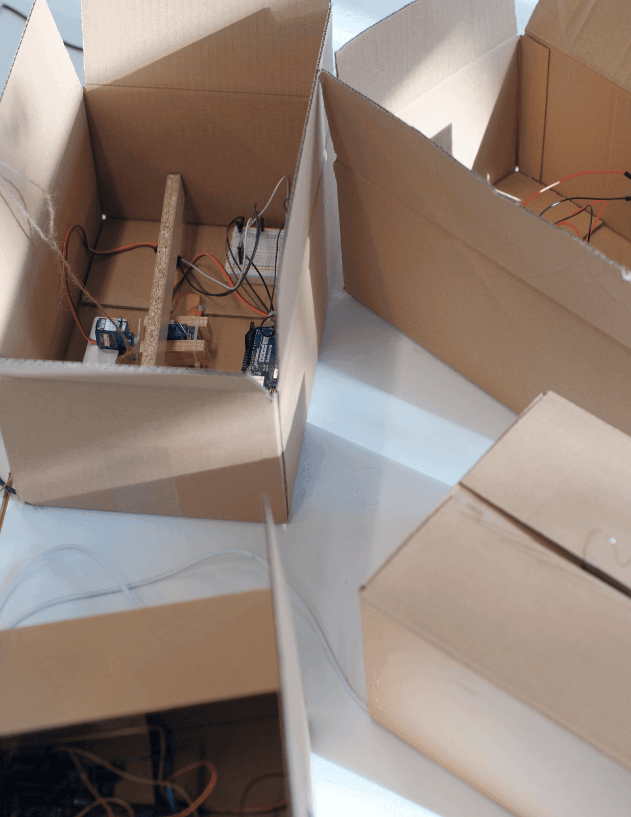 A workshop teaching microcontroller, sensor, and motor fundamentals. Students translate non-technical behaviors—human gestures, animal movements, natural phenomena—into anonymous shipping boxes using limited components. Results range from delicate wire constructions to martially stomping boxes, developing new approaches to embodying behavior in technology.